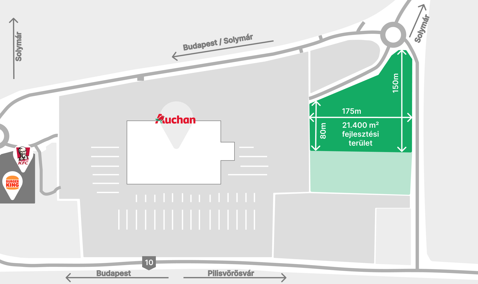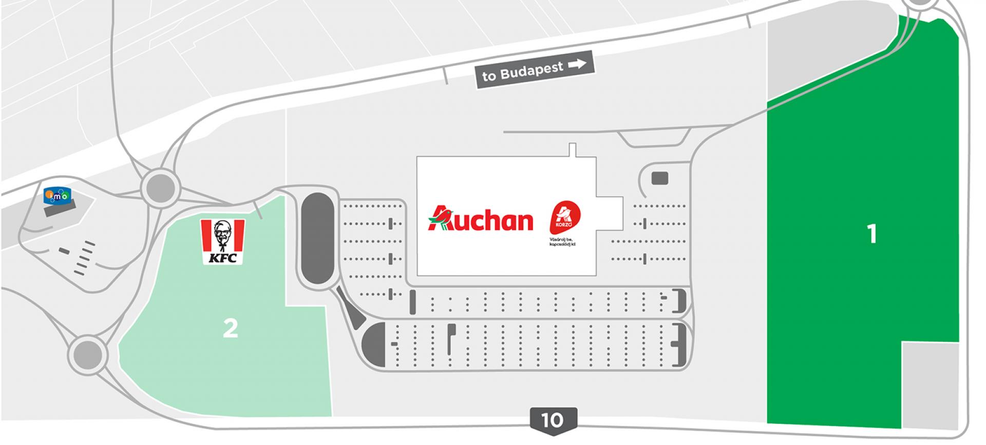 The development area is located within the Auchan Retail Park, bounded by the main road 10 and the Outer Railway Road. The internal road network of the retail park passes in front of the site, where the utility backbone lines are accessible.